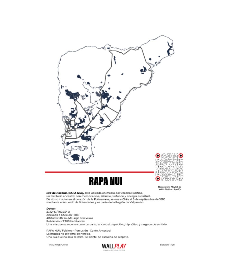 Cuadro decorativo inspirado en el mapa de Rapa Nui (Isla de Pascua), una pieza visual potente que se expresa en un territorio ancestral entre océano y piedra. Memoria viva, silencio profundo y energía espiritual.